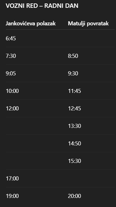 Kako bi se mještanima omogućila veza s centrom Matulja, organizirat će se prijevoz na relaciji Jankovićeva cesta – centar Matulja – Jankovićeva cesta.