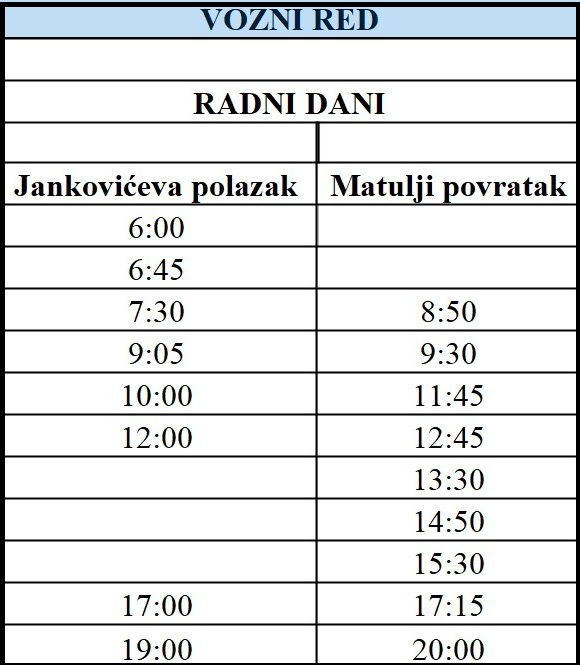 Kako bi se dodatno poboljšala dostupnost prijevoza i omogućila bolja povezanost s centrom Matulja od petka 20.03.2026. godine uveden je još jedan polazak tijekom radnih dana u 17:15 sati.